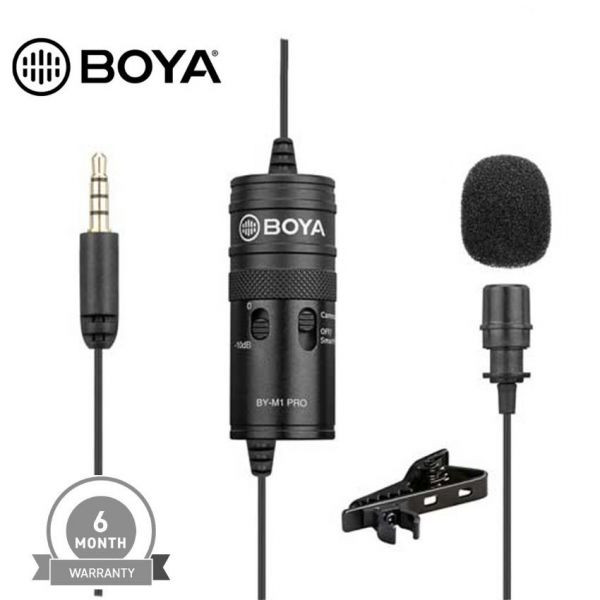 The Boya M1 features a unidirectional condenser microphone to capture sound from the front of the mic only. This helps to reduce background noise and ensure accurate recording quality. The microphone also has an integrated shock mount to help reduce vibration and noise caused by movement. Plus, it comes with a foam windscreen to help reduce wind noise and interference.BOYA M1 Microphone is an omnidirectional Lavalier microphone, perfect for video use, designed for Smartphones, DSLRs, Camcorders, Audio recorders, PC, etc. The Lavalier microphone features an Omni pickup pattern, for full, 360-degree coverage. An integrated 6-meter (20”) cable with a 3.5mm 4-pole gold plug, can connect directly to Smartphones, and most cameras.